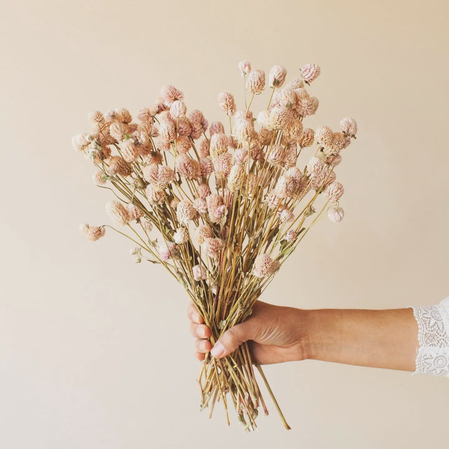 Pretty in pink, the Blush Globe Amaranth is the perfect way to add a splash of color and texture to any arrangement. Grown in the USA. 14-16" Tall Elevate your space with the timeless beauty of our dried flowers from Idlewild Floral Co. Each dried flower bouquet is meticulously crafted, featuring an array of vibrant floral stems that have been picked at their peak and expertly preserved. Ideal for those seeking long-lasting elegance, our preserved flowers are perfect for any decor style.
